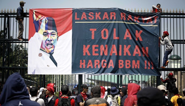 Protesta contra el aumento del precio de la gasolina con una pancarta que muestra la imagen de Sukarno, el primer presidente de Indonesia y padre de Megawati Sukarnoputri, la lideresa del PDI-P